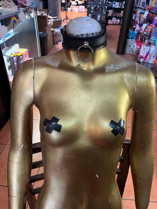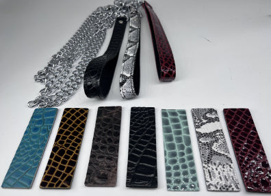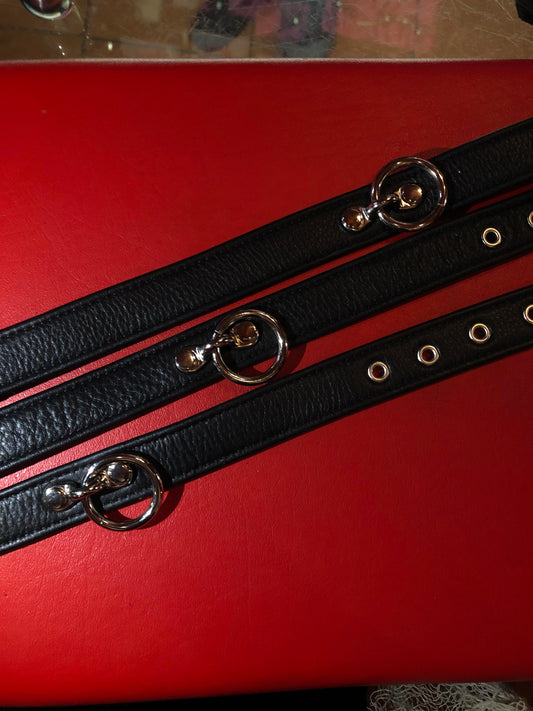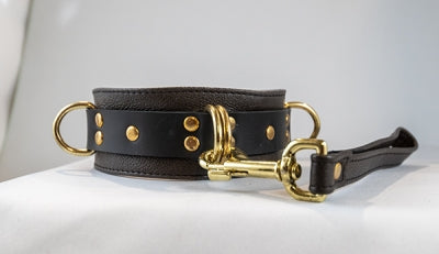 Leather, vegan, fabric, and metal collars for bondage, day collars, chokers, as well as leashes and leads.