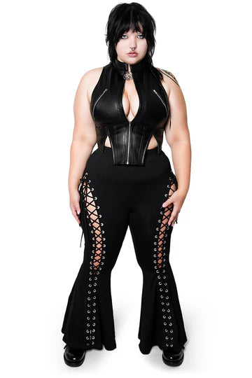 Stop the show with the newest Opium Vest. This edgy statement features YKK zippers, our premium vegan leather material, and corsetry inspired details. The zippers on the chest are decorative and open to solid fabric underneath, while the middle zipper can be worn all the way zipped up or half down, depending on your taste.